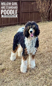 Willow is a large tricolor AKC Standard Poodle that has a nice square and balanced conformation that will likely finish in the 60 lb range. She is clear of her poodle genetic disease panel and has good OFA hips and elbows. She is as sweet as can be, easy going, and has a playful goofy side to her. She is stunningly beautiful as you can see and has the big thick structure we strive for in our poodles.